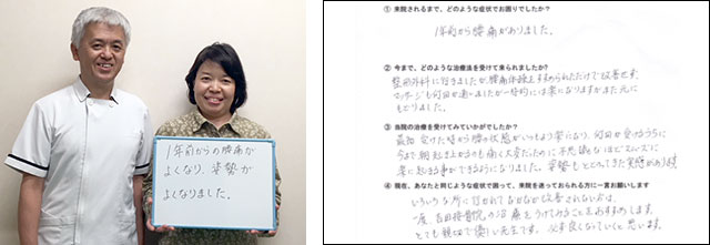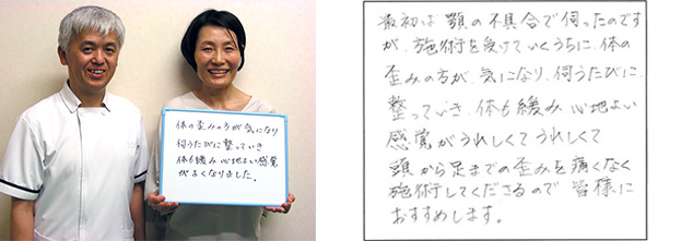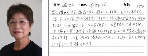 若い頃から、腰痛、肩こりに困っていました。先生に相談しまして、この治療を受けることにしました。治療の方法は全く痛みがなく、いつも寝てしまいそうになるほど気持ちよく、一週間に一度の先生の治療が楽しみです。治療をうけますと、2~3日腰の痛みがなくなります。この先続けて痛みがなくなり、元気に主人と旅行に行くことを願っています。