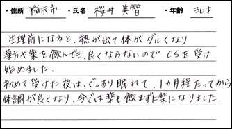 生理前になると、熱が出て体がダルくなり、漢方や薬を飲んでも、良くならないので,CSを受け始めました。