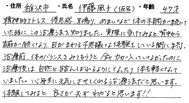 精神的ストレス、倦怠感、耳鳴り、めまいなど体の不調が続いていた時に、この治療法を知りました。実際に受けてみると、背中から首筋が熱くなり、目がまわる不思議な体験をしている間に終了。治療前、体のバランスをみてもらうと全て力が入っていなかったのに、治療後は自然と踏ん張れるようになったり体も軽くなっていました。心身共に元気にさせてくれる治療法だと思います。体験してみると良さが必ずわかると思います!!