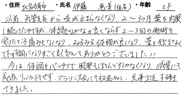 以前、気管支炎から咳が止まらなくなり、2~3ヶ月薬を内服し続けたのですが、体調もなかなか良くならず、2~3回の施術を受けたところ痛みもなくなり、みるみる体調が良くなり、薬を飲まなくても好調になり、すごくよく効いてありがとうございました!!