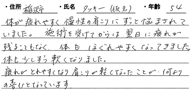 ・住所 稲沢市 ・氏名 タッキー様(仮名) ・年齢 54歳