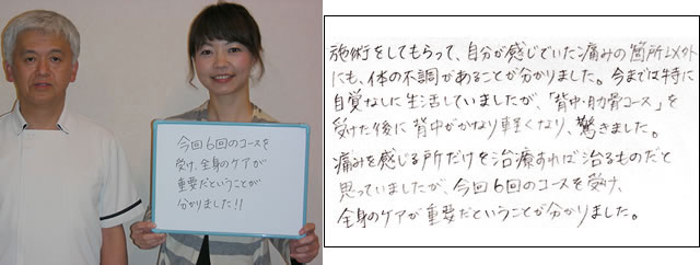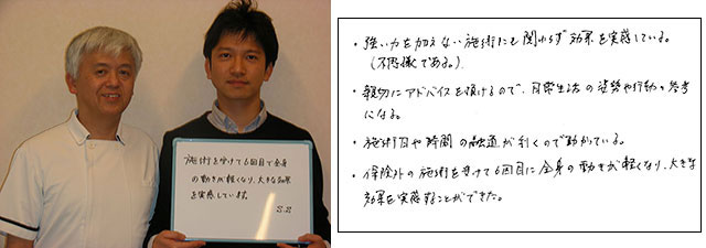 最初は、本当に良くなるか不安でしたが、1回目2回目と治療をしていくうちに痛みが出る日が少なくなり、3回目の治療の後からは1度も痛みは、出ていません。今では本当にCS治療をして頂いて良かったと思っています。ありがとうございました。