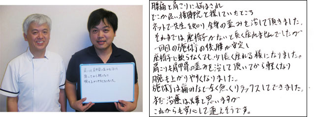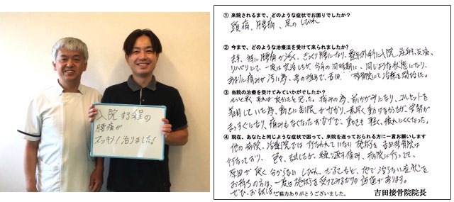 去年、特に腰痛が汚く、ぎっくり腰になり、整形外科に入院、注射、点滴、リハビリにて、一度は完治したが、今年の同時期に、同じような状態になり、あまりに痛みが汚い為、妻の推めで、吉田接骨院にて治療を開始した。