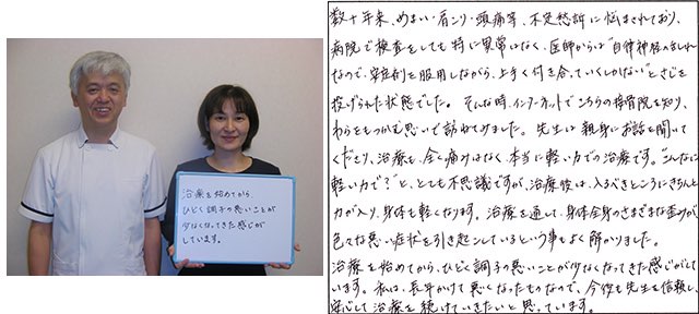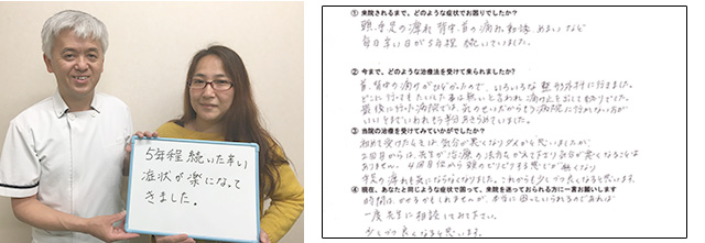 初めて受けた夜は、ぐっすり眠れて、1カ月程たってから体調が良くなり、今では薬も飲まずに楽になりました。
