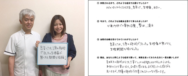 息苦しさは、1度の施術で治った。生理痛が無くなり、生理期間も短くなった。